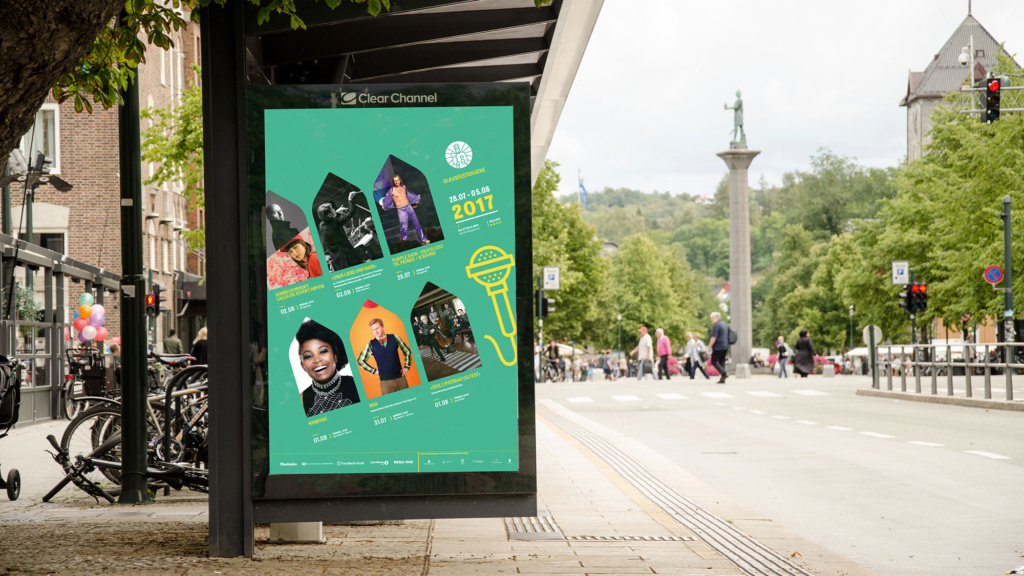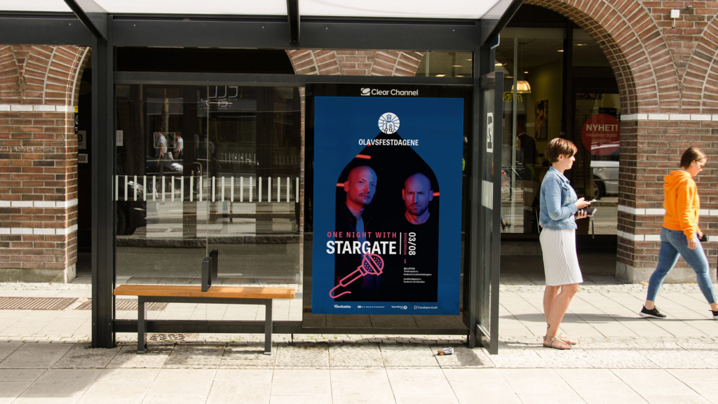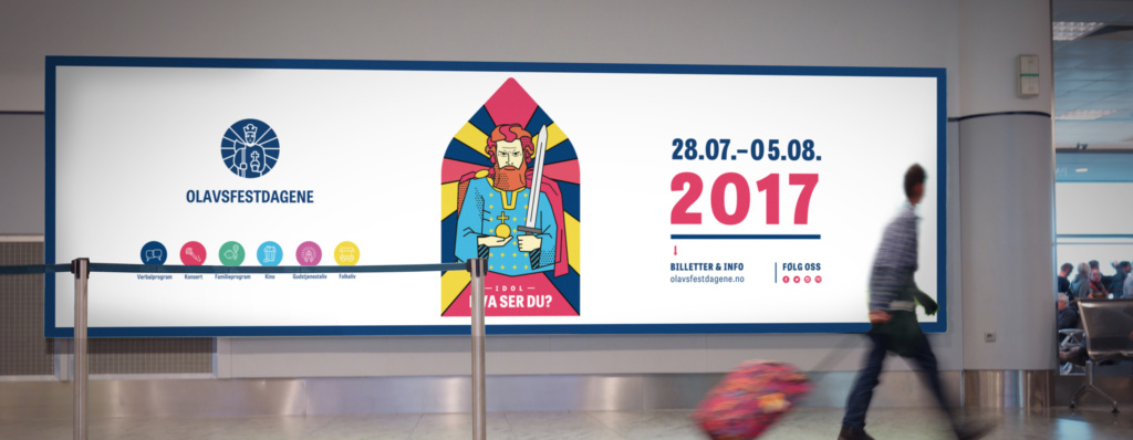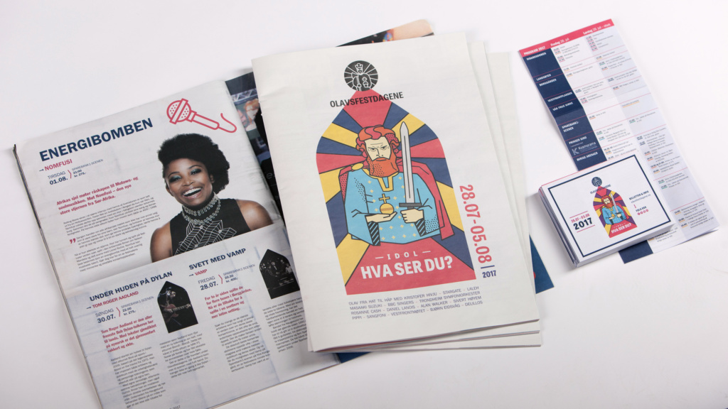 Noe av det første vi gjorde, var å justere Olavsfestdagens logo. Ved å gå bort fra den fargerike logoen, og i stedet vise en nedtonet variant, ble profilen som ny. Kombinert med ny typografi, fremsto festivalen tydeligere. Den nye profilen, med fokus på årets konsept, tok vi ut på alt fra plakater – i forskjellig layout og størrelse – til festivalavis, t-skjorter, program, etc.