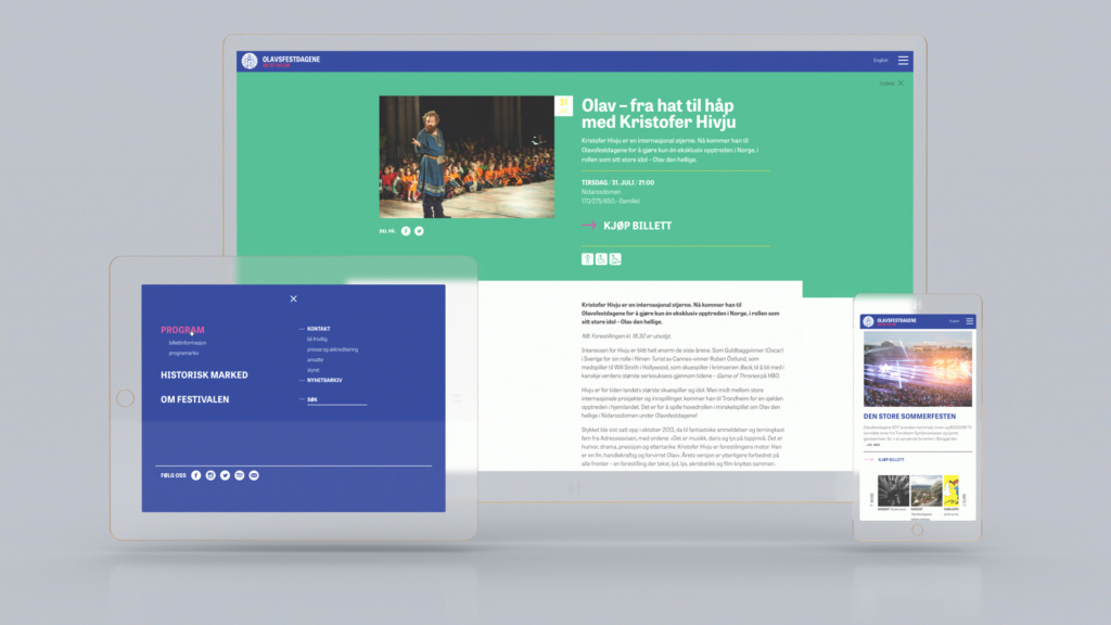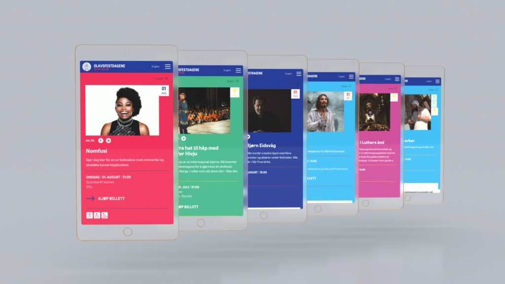 Konseptet er også tydelig til stede i Olavsfestdagenes nye nettside, som Headspin har utviklet. Hovedmålet med den nye nettsiden er å forenkle, og på den måten også forbedre, brukeropplevelsen. Det skal være enkelt å navigere seg frem til både program og billettkjøp – og det skulle bare mangle, med 200 spennende arrangementer å velge mellom!