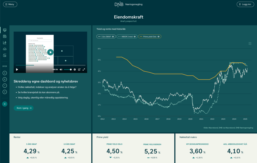 Det er en rekke standard nøkkeltall som de fleste i bransjen sjekker ofte; som Prime yield, 5 års SWAP, transaksjonsvolum og kontorledighet. Disse satte vi sammen i ett grafsystem, spesielt for dem som kun er ute etter disse.