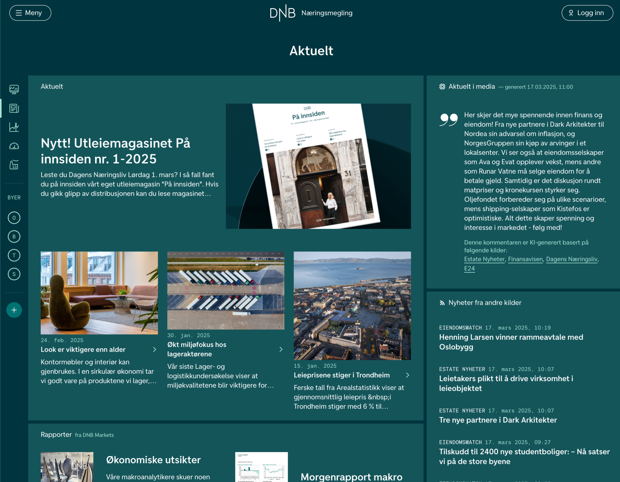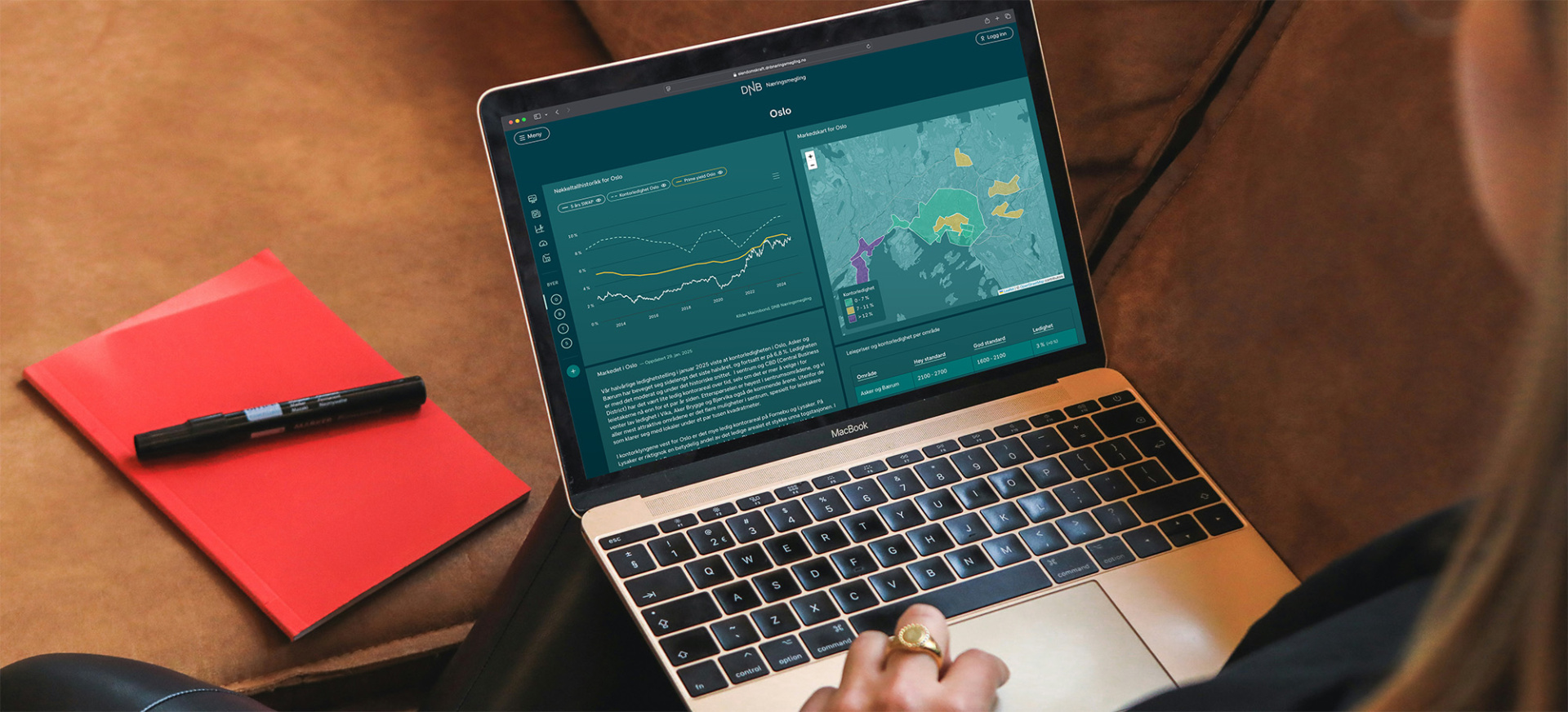 Når tiden nå var moden for fornyelse, ble det satt høye ambisjoner. De ønsket en løsning som viser tankelederskap og som setter en ny bransjestandard. En brukervennlig løsning som løftet den statiske, digitale markedsrapporten til en dynamisk, brukerstyrt analyseportal. Gjennom å vise tankelederskap ønsker DNB Næringsmegling å være den megleren som kunder går til for å få innsikt og markedsoppdateringer – og at nettløsningen for dette skulle være den klart beste.
