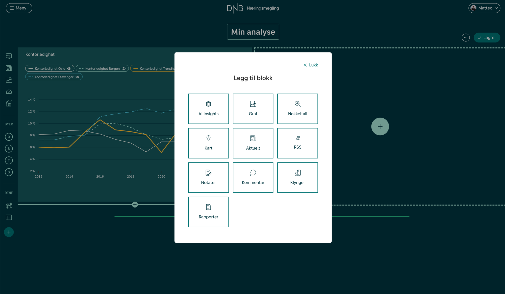Sammen med DNB Næringsmegling utviklet vi dette videre. Vi ville la brukerne få velge hvilke data de ønsket å se. Ikke bare typiske bransjedata, men også andre tall som er relevante for dem, hvor man bruker ulike kilder for å hente disse. I tillegg ville vi gi alle muligheten til å lage egne «dashboards» – rett og slett skreddersy sin egen oppdatering.