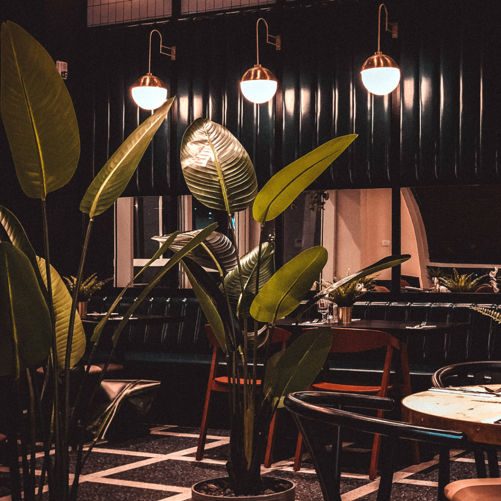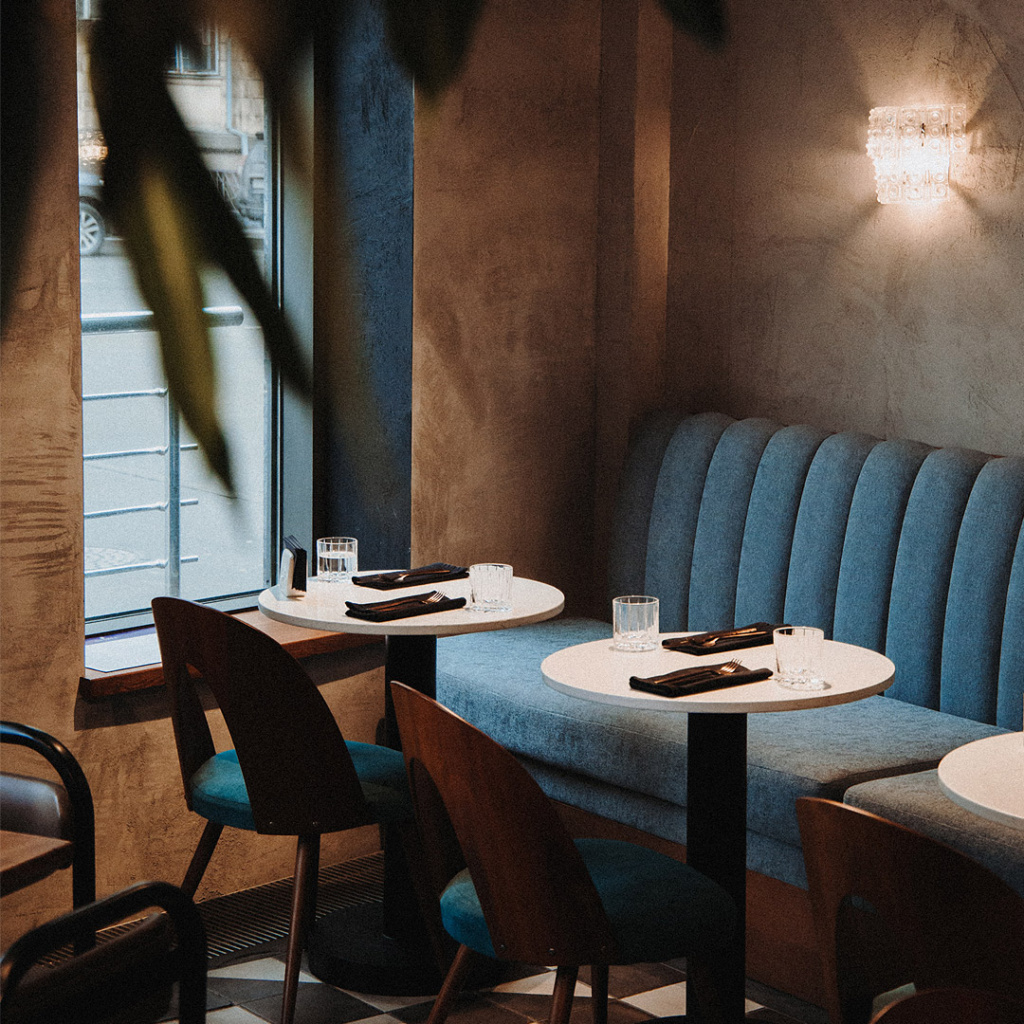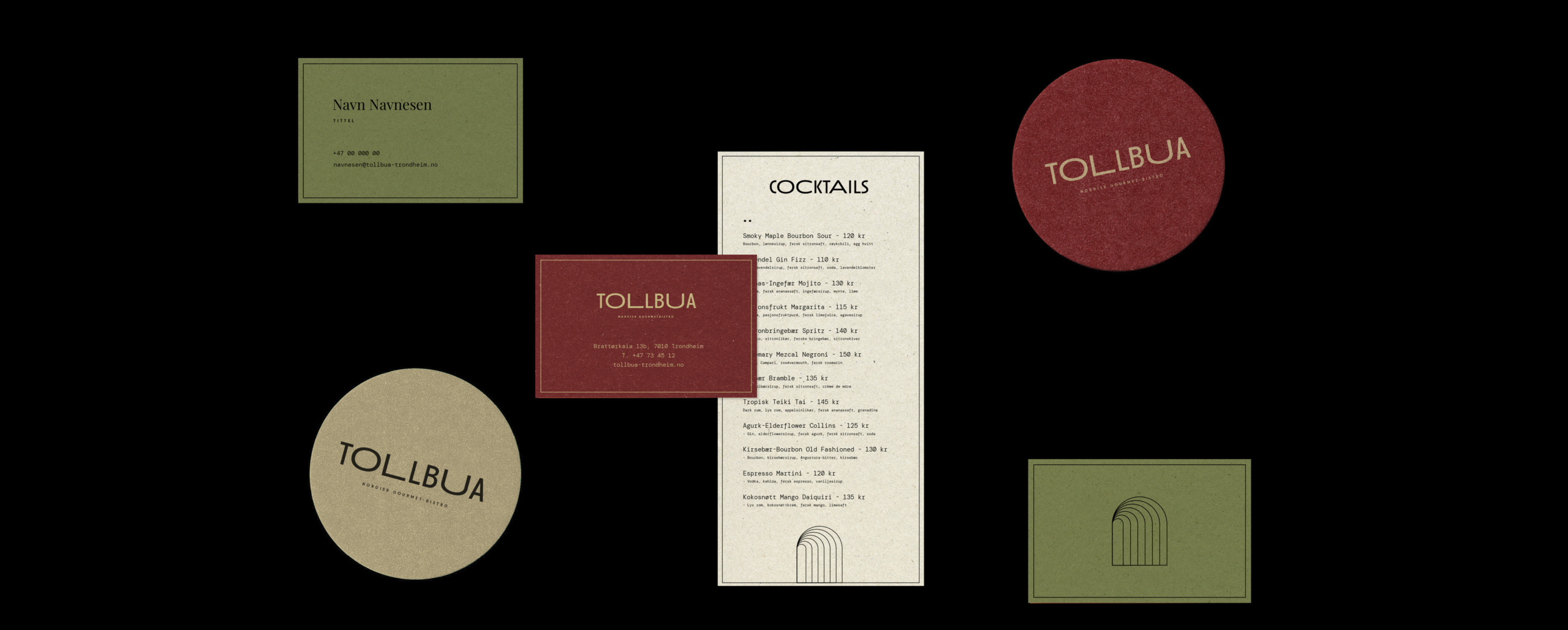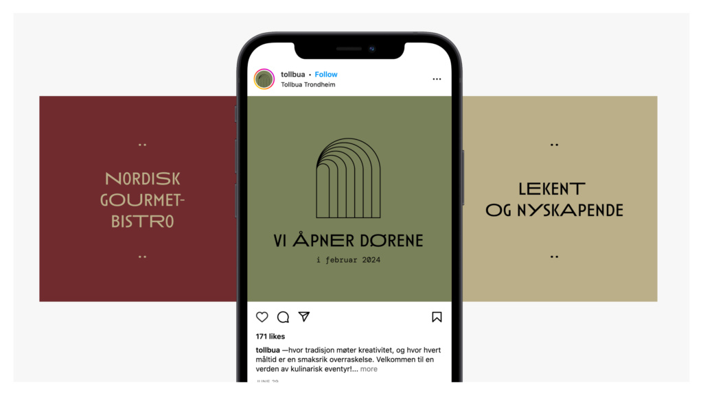 Vi har utviklet en leken og elegant visuell identitet med typografisk logo. Det overordnede uttrykket er retroinspirert med klassiske vintageelementer fra 1920-årene. Det hele blir kommunisert gjennom dempede farger og en brødtekstfont inspirert av skrivemaskiner. Fargepaletten henter sin inspirasjon fra byggets ikoniske grønne dør, og sammen med den varme bildestilen skapes stemningen du får når du besøker restauranten. Illustrasjonen av myke bueformer spiller også på den store døren, og brukes både på nettside, sosiale kanaler og fysiske flater.